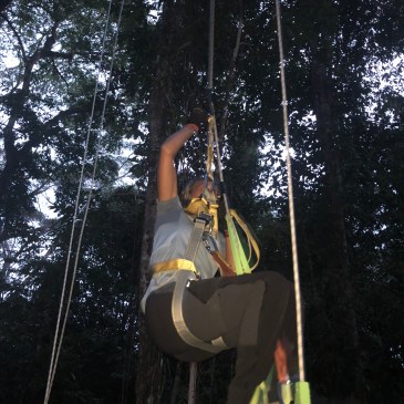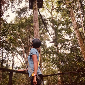 Nous quittons la communauté à 9h direction le dernier endroit où nous allions dormir, à 2h de barque environ, encore plus proche de la côte vénézuélienne. Nous retrouvons le couple qui nous a accueilli à l’aéroport qui nous emmène dans un gîte perdu au milieu de nulle part mais bien plus confort que ce qu’on a vu ces 3 derniers jours. Nous avons une vraie salle de bain avec de vraies toilettes, wouhou, le luxe ! Au programme d’abord, petite baignade en eau douce couleur rouge sang, c’est assez impressionnant et très agréable, on se repose un peu et on se rince. On part à travers la forêt amazionienne pour aller faire de l’accrobranche à 20 mètres de haut. On monte soi-même via une longue corde, c’est très très endurant. Une fois là-haut, wahoo c’est grandiose et impressionnant. Comme en accrobranche on traverse des ponts en bois, on admire les oiseaux et on redescend. Très sympa !