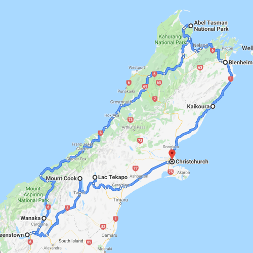 Itinéraire 3 semaines sur l’île du Sud (comment moi je l’ai réalisé, bien sûr ceci n’est qu’un exemple)