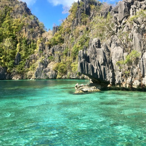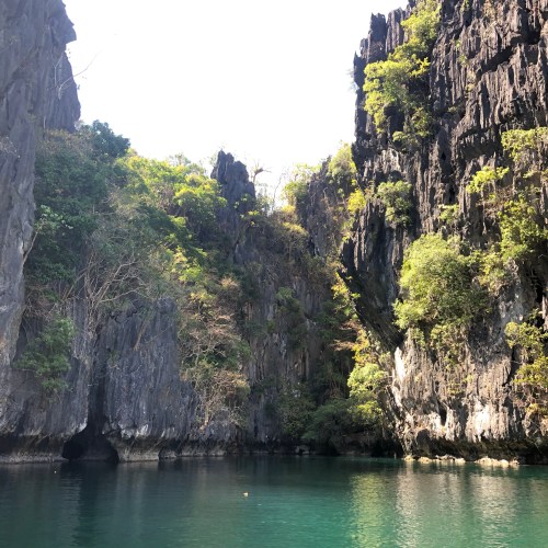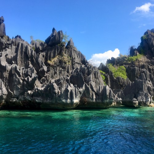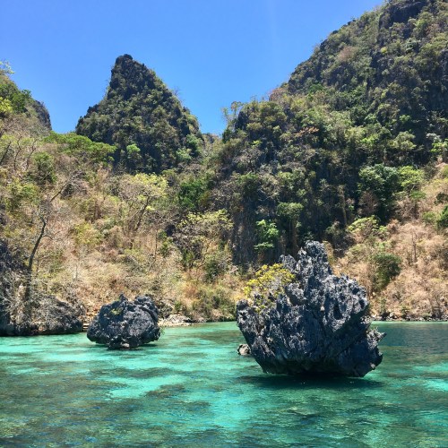Départ le 5e jour pour Coron Island, connue cette fois pour ses fonds marins hors du commun et ses lagons qu’on ne compte même plus. Étant allée à Coron il y a 4 ans avec un groupe d’amis et ayant eu un véritable coup de cœur pour l’endroit, j’avais hâte de le faire découvrir à Val. Nous avons adoré l’endroit, malgré une triste surprise de mon côté : une horde de touristes jamais vue auparavant. Les îles désertes découvertes en 2015 sont aujourd’hui encerclées de 1000 bateaux transportant des touristes du monde entier. Malgré ce grand développement touristique je me surprends à voir que la préparation des activités n’a pas changé: rdv au bateau à 7h30 du matin, départ à pied au marché public où l’on achète notre poulet, notre riz, nos fruits et notre eau, sans oublier le charbon pour cuire notre déjeuner sur le bateau et le manger au milieu des poissons (déjeuner préparé par les guides). On traversera les îles sur les bateaux typiques philippins, en compagnie d’Emile, notre mémorable guide au quotidien. Par chance, nous lui avons demandé chaque matin de nous emmener loin des touristes, en faisant les tours à l’envers, c’était top.