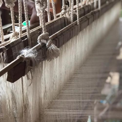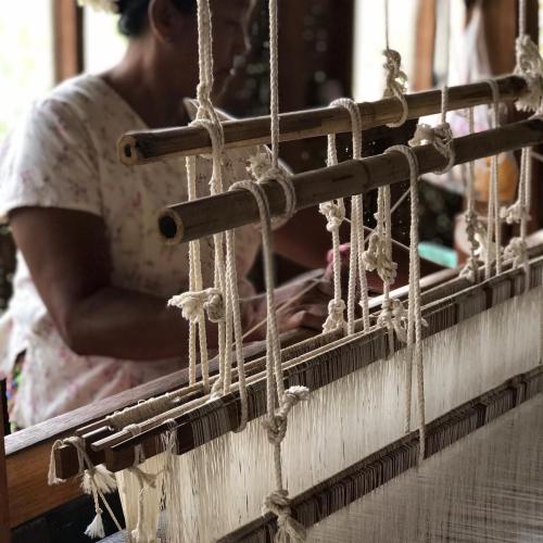 Nous traversons également les jardins flottants où poussent de nombreux fruits et légumes accrochés à leurs longs bambous. Puis nous prenons le temps de visiter un atelier de tissage au fil de Lotus où nous découvrons ces femmes en plein ouvrage, c’est très inspirant.