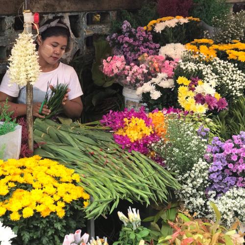 Bref, le lendemain matin direction le marché de Yangon et ses nombreux stands. Nous déambulons parmi les étales de nourriture, les marchants de tissus, de perles, d’objets nacrés ou en bois, souvenirs en tous genres. Nous perdons plusieurs fois nos repères lorsque l’électricité se coupe et laisse place à des allées plus sombres.
