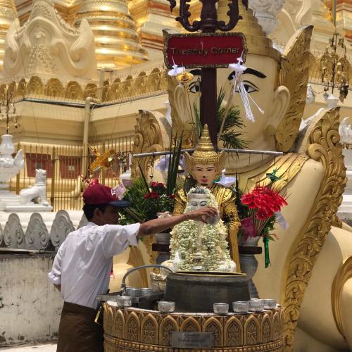 Après deux heures de « shopping », nous allons découvrir LA pagode de Yangon, considérée comme la plus impressionnante de la Birmanie, d’où le fait que nous l’ayons visitée après les temples de Bagan. Effectivement, elle est comme on nous l’a présentée : impressionnante par sa taille, son nombre de visiteurs et de croyants. Le charme des pagodes de Bagan nous semble alors bien loin… Oui, elle vaut le détour mais ne nous a pas fait vibrer comme d’autres.