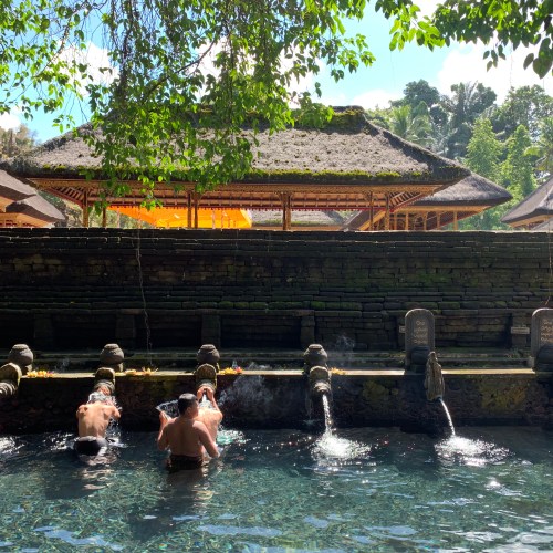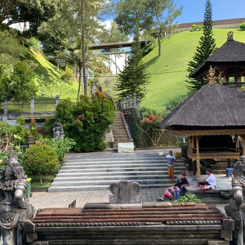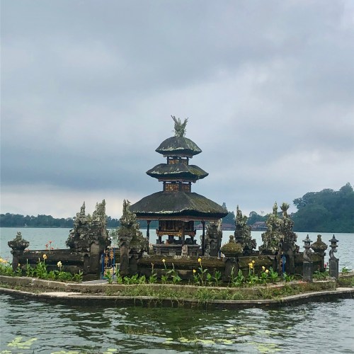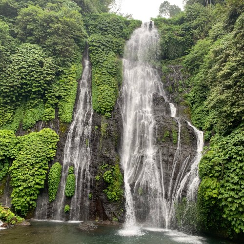 Après les rizières, nous continuons notre roadtrip vers les cascades de Banyumala avec un détour par un temple, le Pura Ulun Danu Bratan – le temple sur les billets de 50 000 IDR – mais quelle déception : des touristes à perte de vue, des statues Bob l’Eponge et des pédalos Cygnes tout autour du temple… Déçus, nous repartons rapidement et nous nous arrêtons dans un Warung tenu par un Français que notre guide connaissait, un restaurant délicieux et avec une vue imprenable sur le lac ! Le temps se couvre un peu pour la découverte des cascades mais cela n’enlève en rien la magie du lieu, et cette nature toujours aussi verte et riche autour de nous continue de nous fasciner.